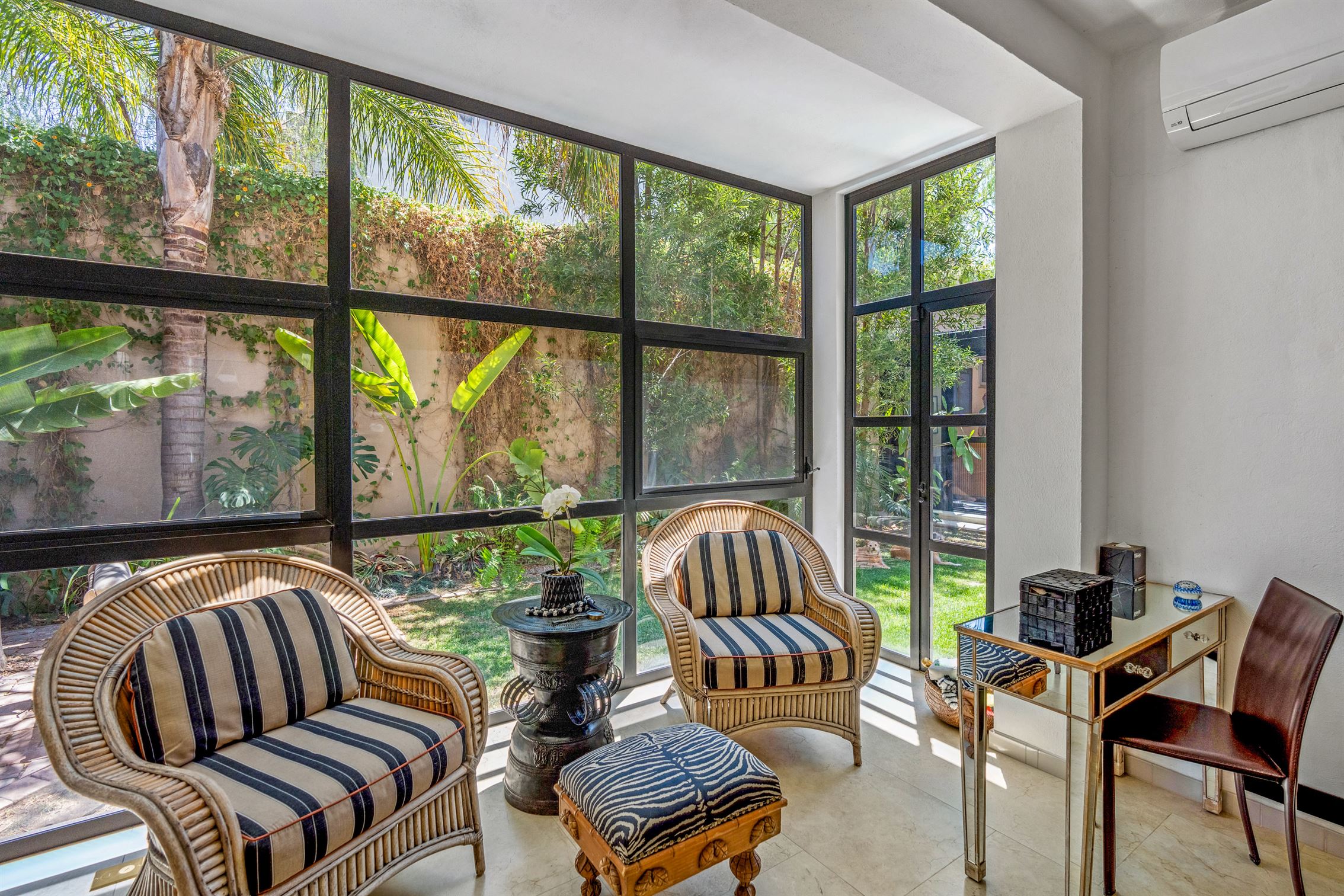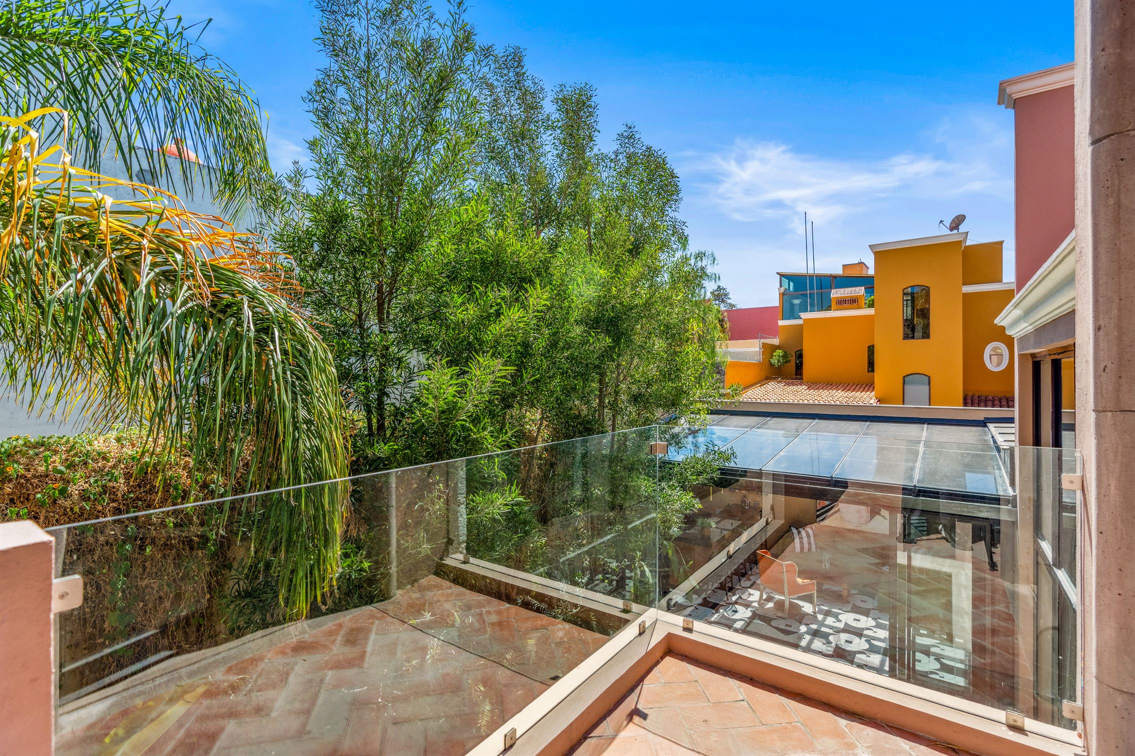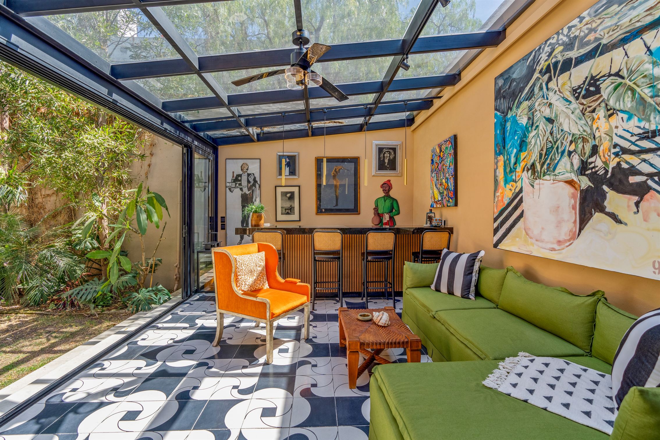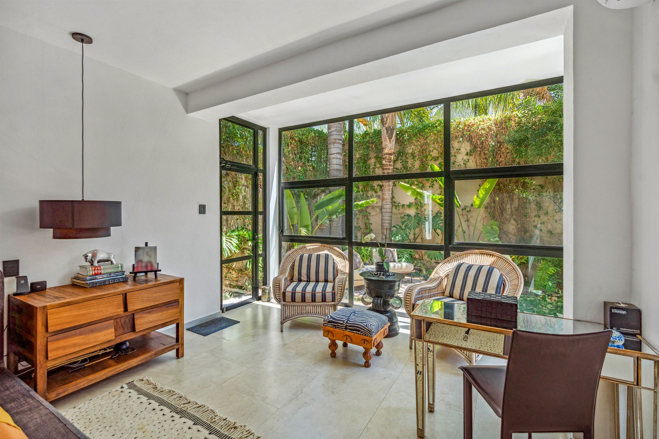 Además, hay un porche de sol cerrado en vidrio con vista al jardín, que cuenta con un hermoso bar—perfecto para entretener a tus invitados. Y no olvidemos el baño de visitas, que es una verdadera obra de arte, exhibiendo un mural de flamencos y un impresionante lavabo de ónix en pedestal.