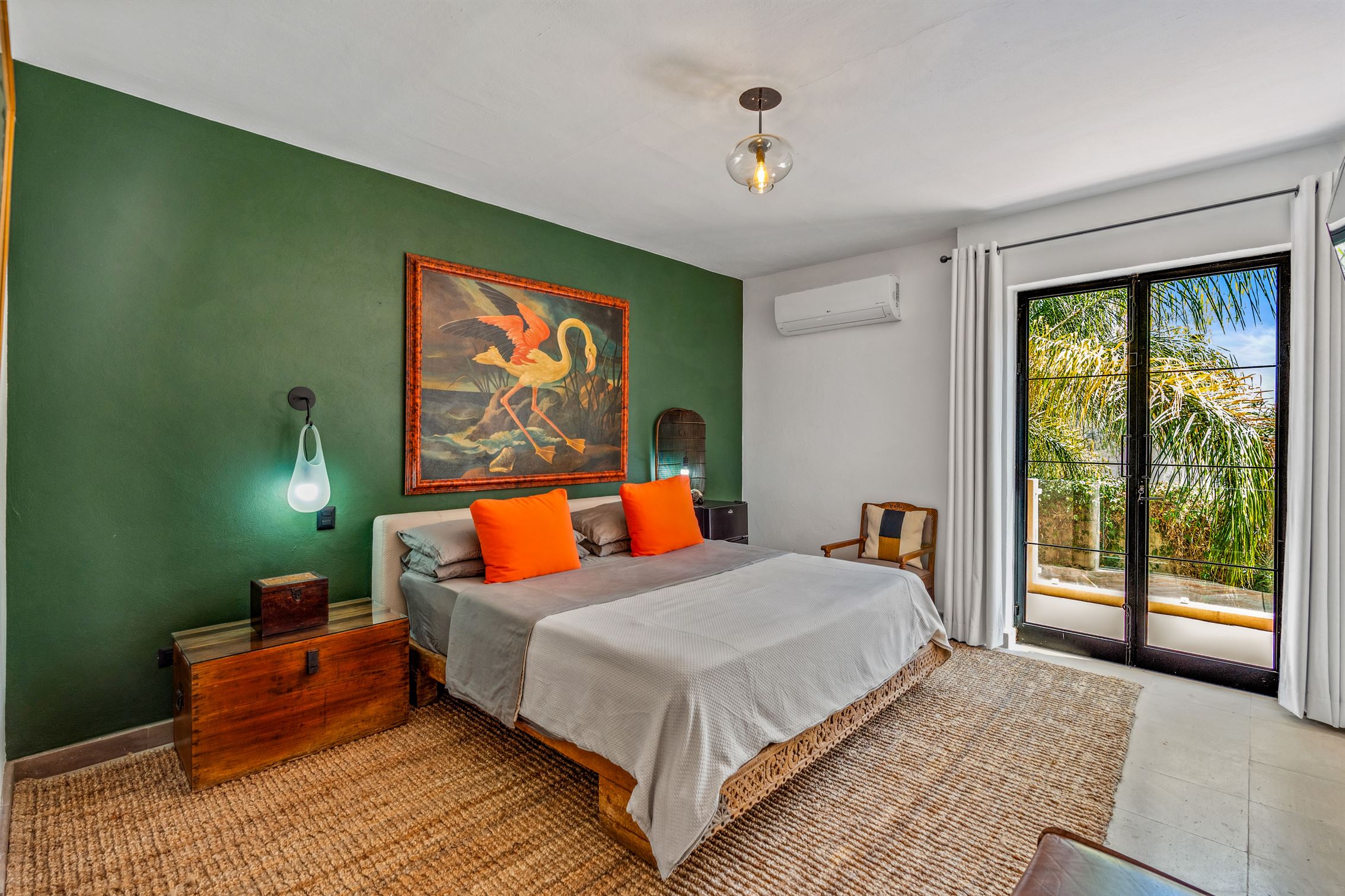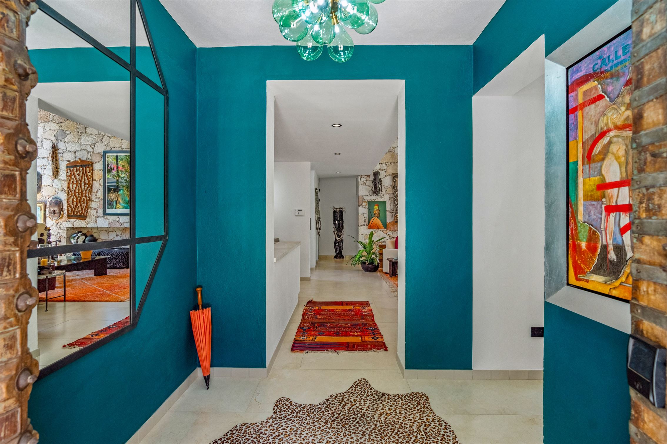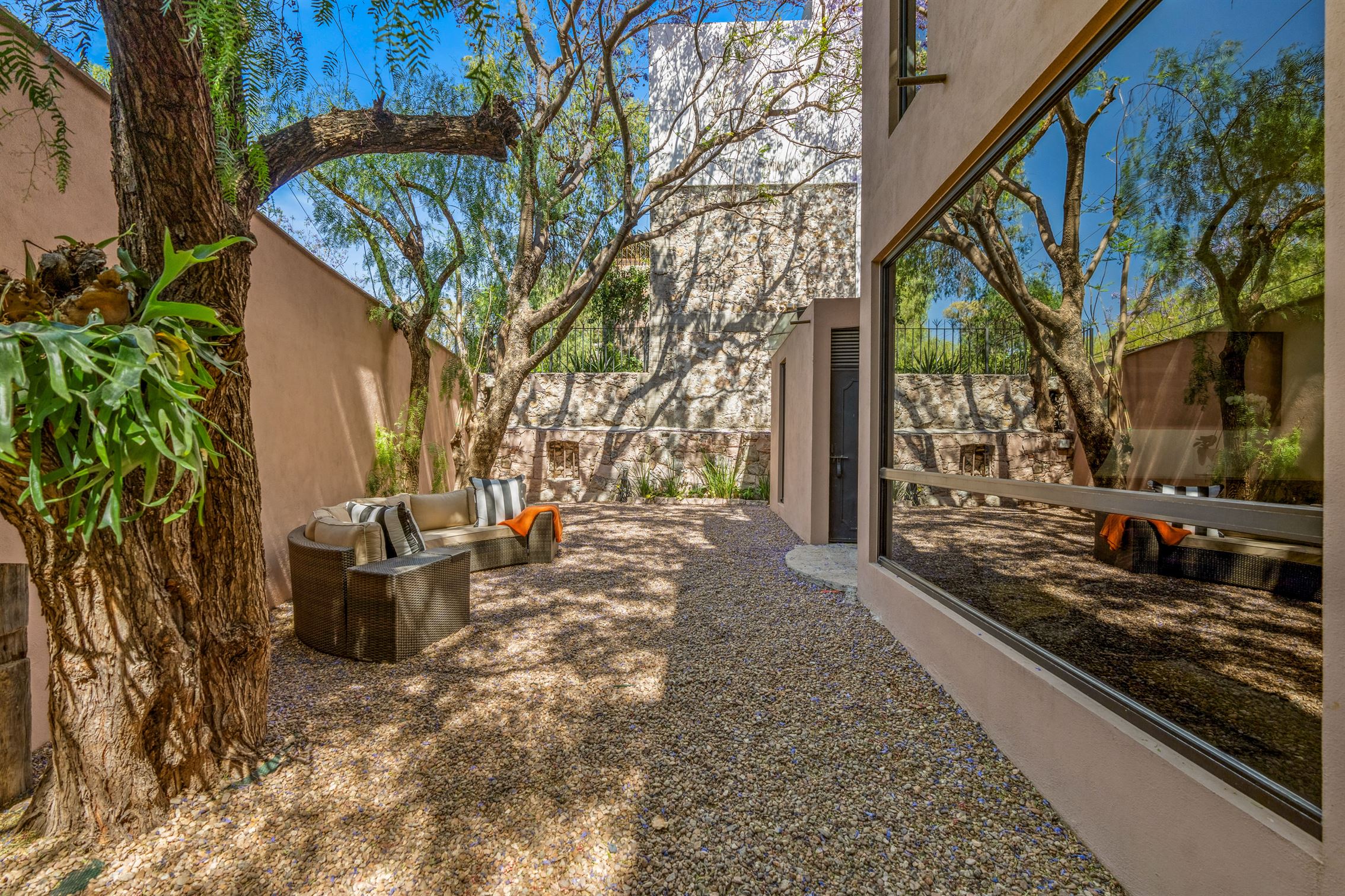 Además, hay un porche de sol cerrado en vidrio con vista al jardín, que cuenta con un hermoso bar—perfecto para entretener a tus invitados. Y no olvidemos el baño de visitas, que es una verdadera obra de arte, exhibiendo un mural de flamencos y un impresionante lavabo de ónix en pedestal.