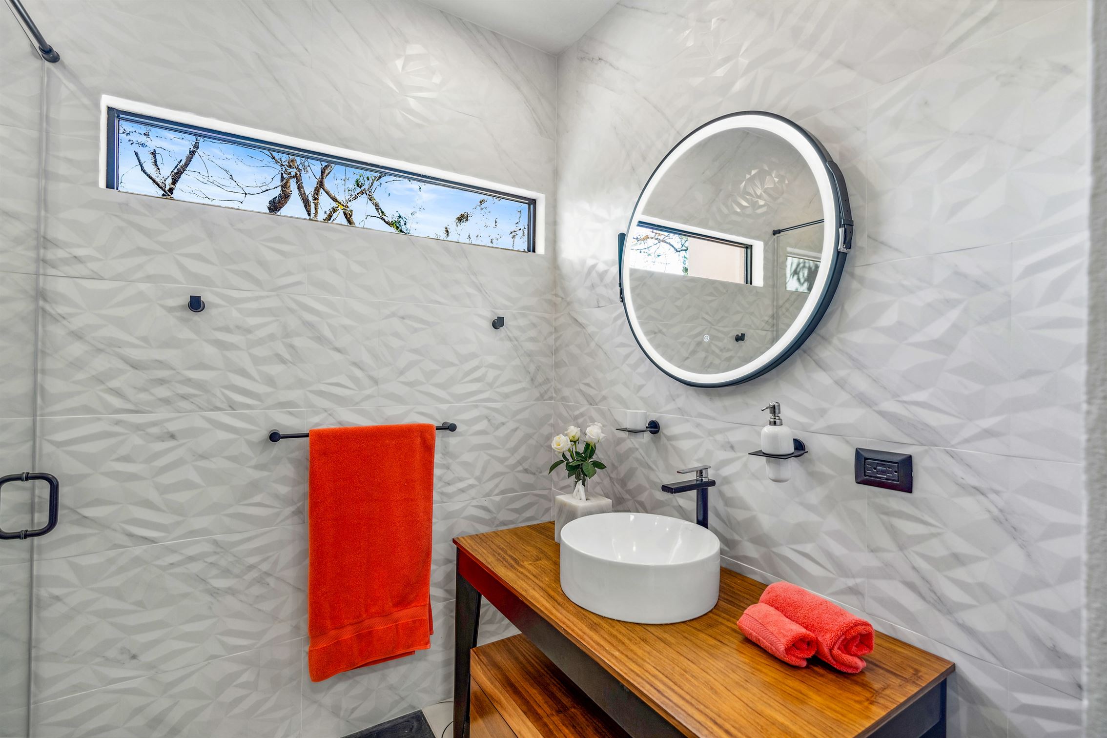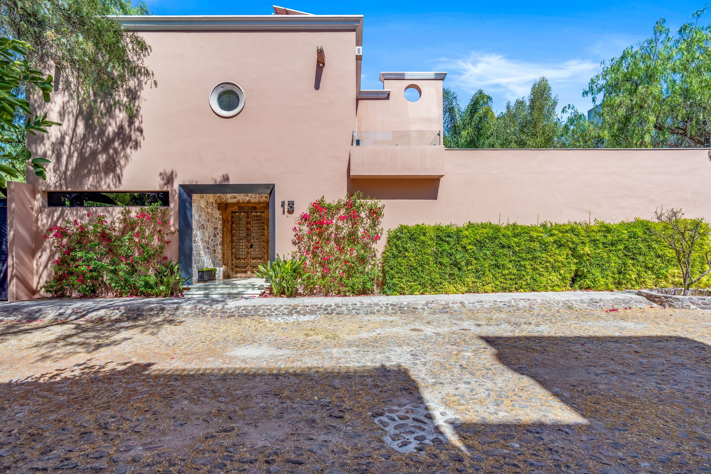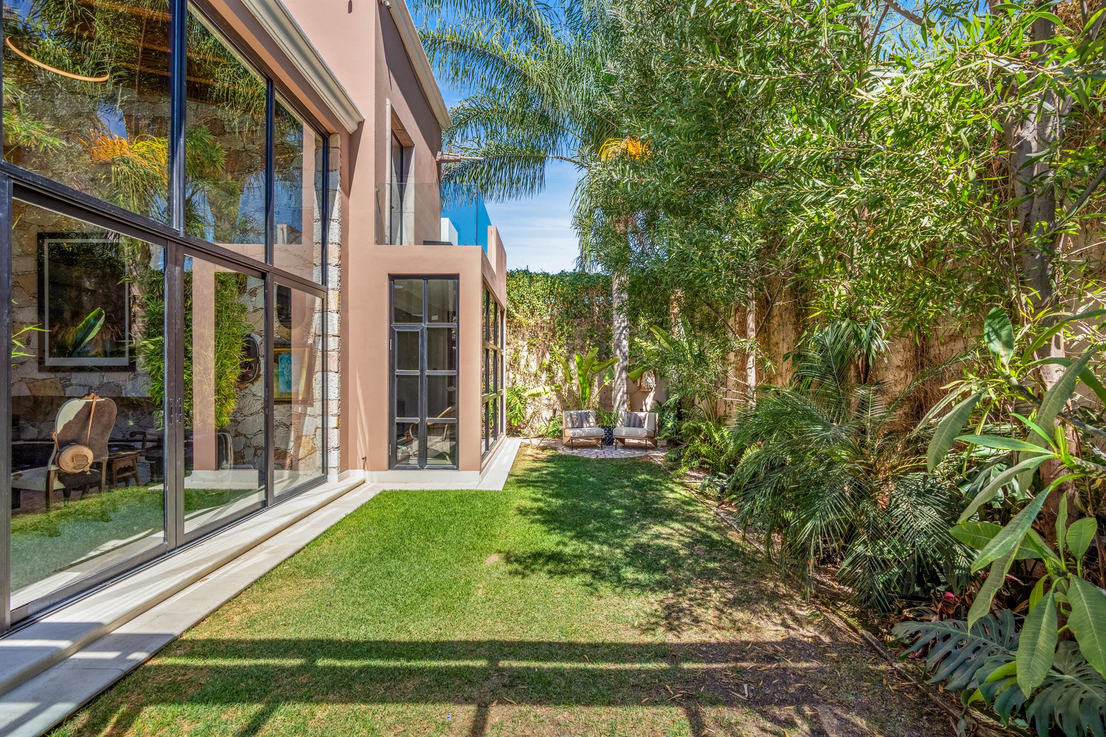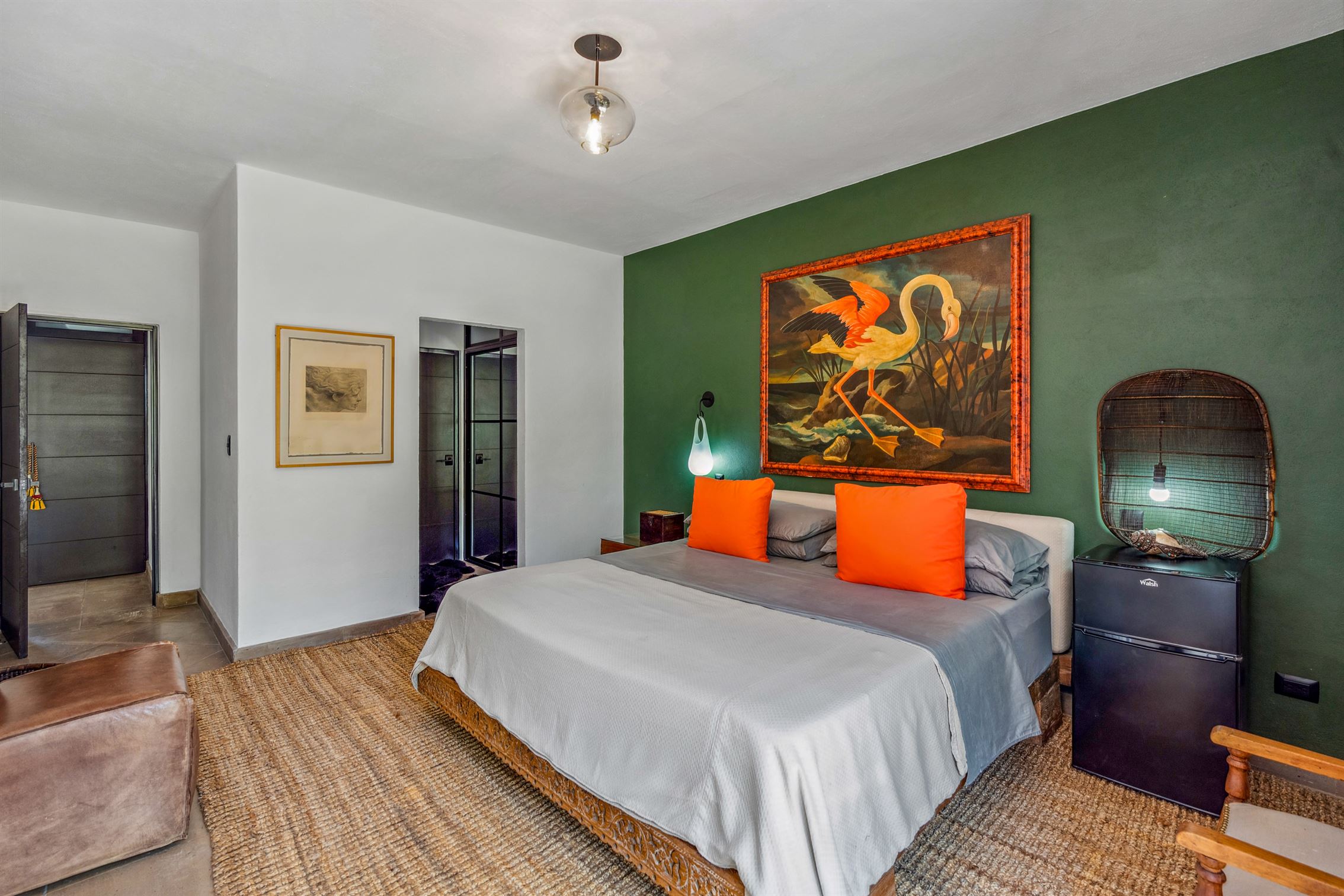 Además, hay un porche de sol cerrado en vidrio con vista al jardín, que cuenta con un hermoso bar—perfecto para entretener a tus invitados. Y no olvidemos el baño de visitas, que es una verdadera obra de arte, exhibiendo un mural de flamencos y un impresionante lavabo de ónix en pedestal.