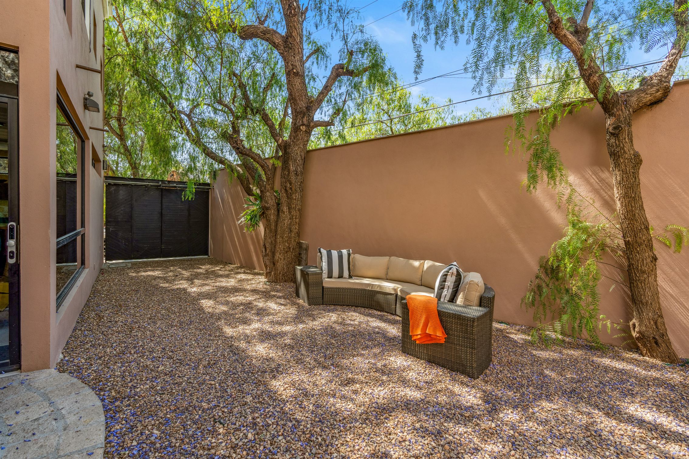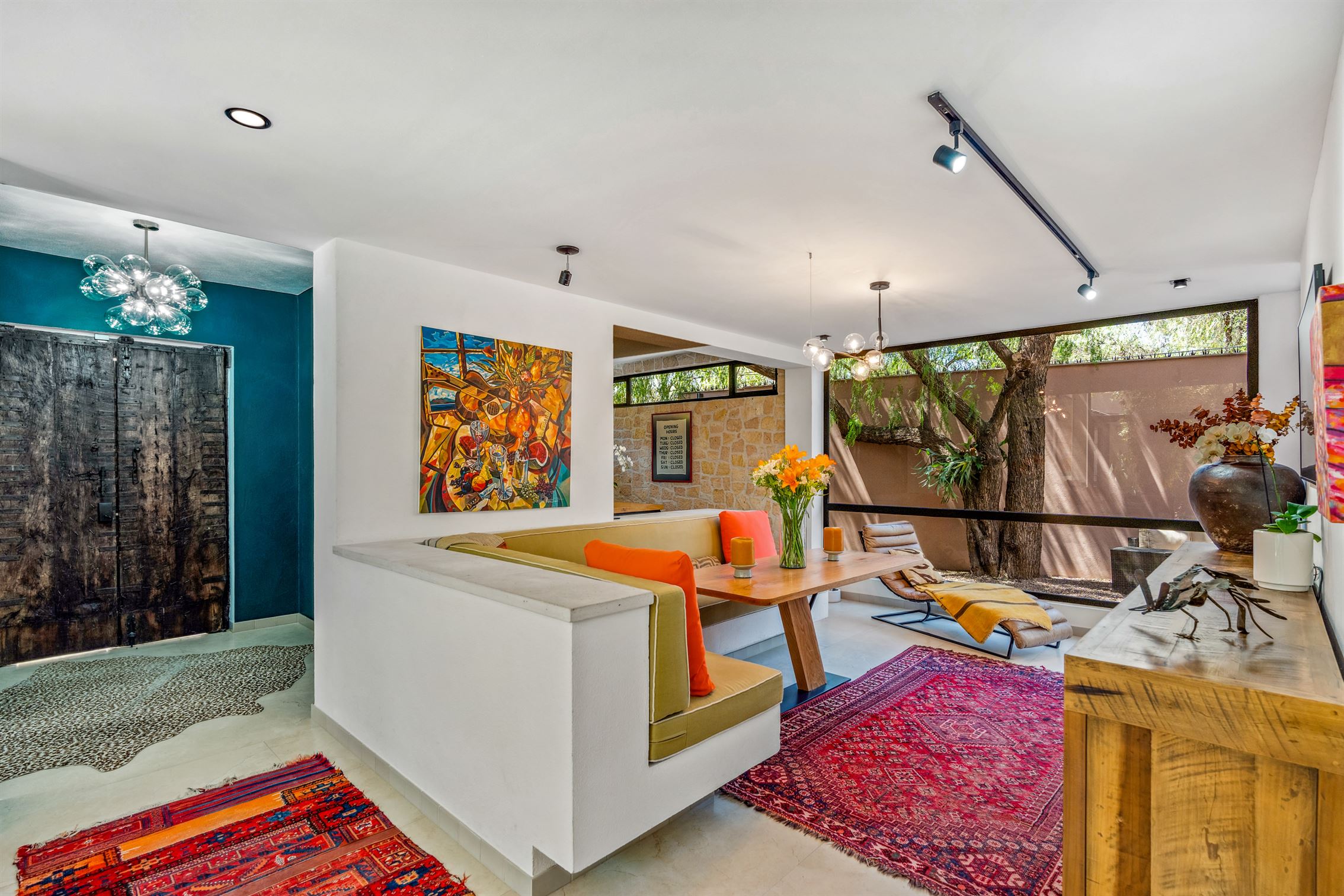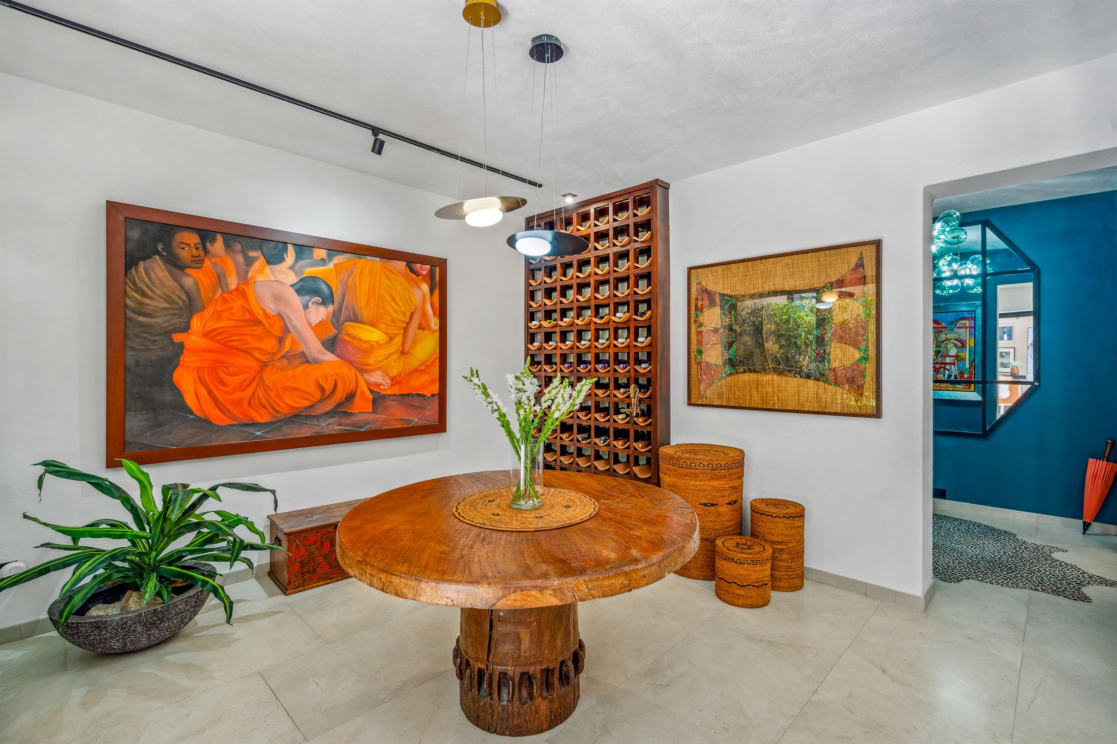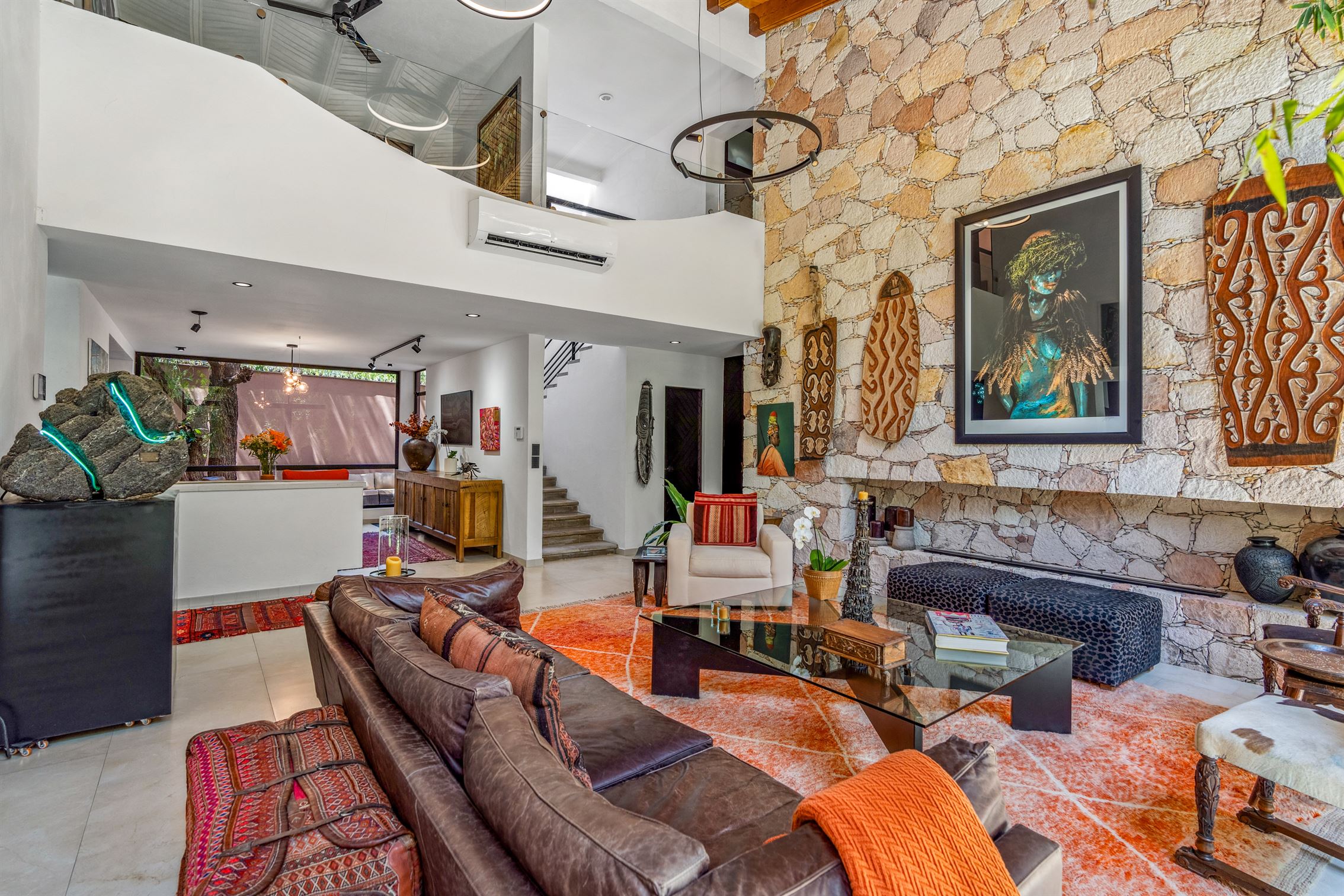 Esta residencia contemporánea y moderna ubicada en prestigiosa comunidad privada logra el equilibrio perfecto con su exquisita decoración, que presenta elementos de todo el mundo—Indonesia, África, Nepal y Hawái—todos unidos para crear calidez y armonía a través de fibras naturales, textiles, colores vibrantes y ricas texturas.