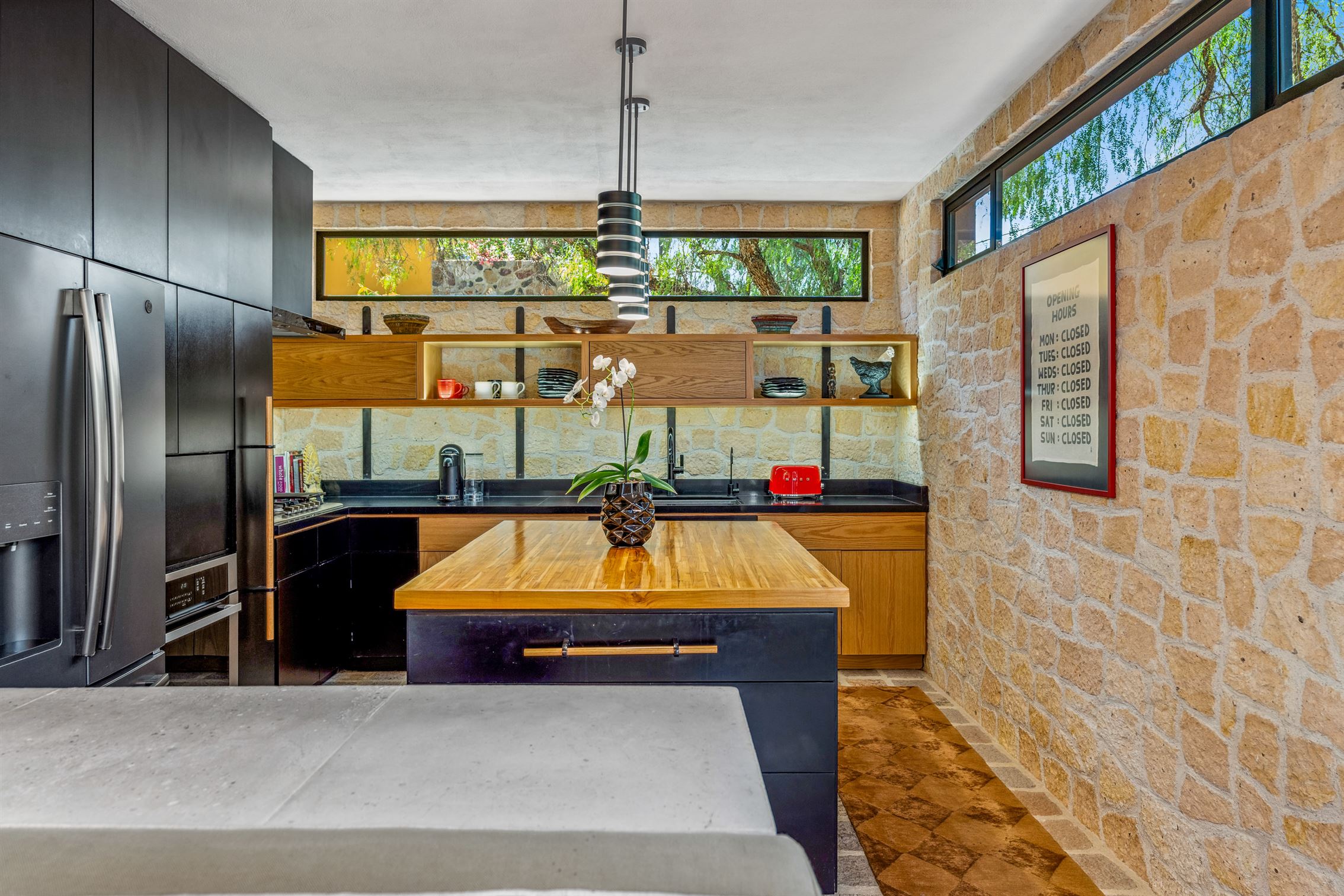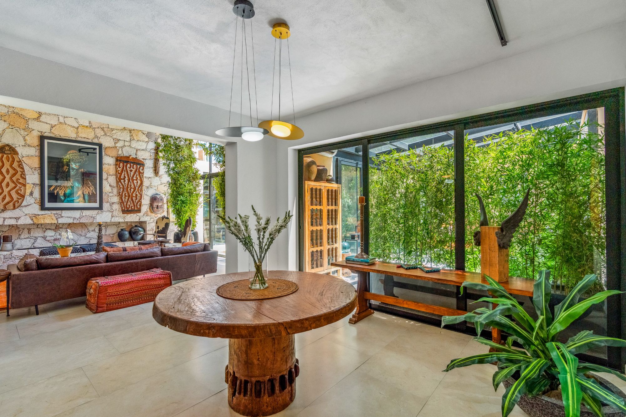 Desde allí, entras a una impresionante sala de estar con techos de doble altura adornados con vigas de madera y una dramática pared de piedra de piso a techo con una chimenea contemporánea. Tu vista se extiende sin interrupciones hacia el exuberante jardín, lleno de vegetación tropical, palmeras, plumerias, orquídeas y, por supuesto, hermoso bambú.