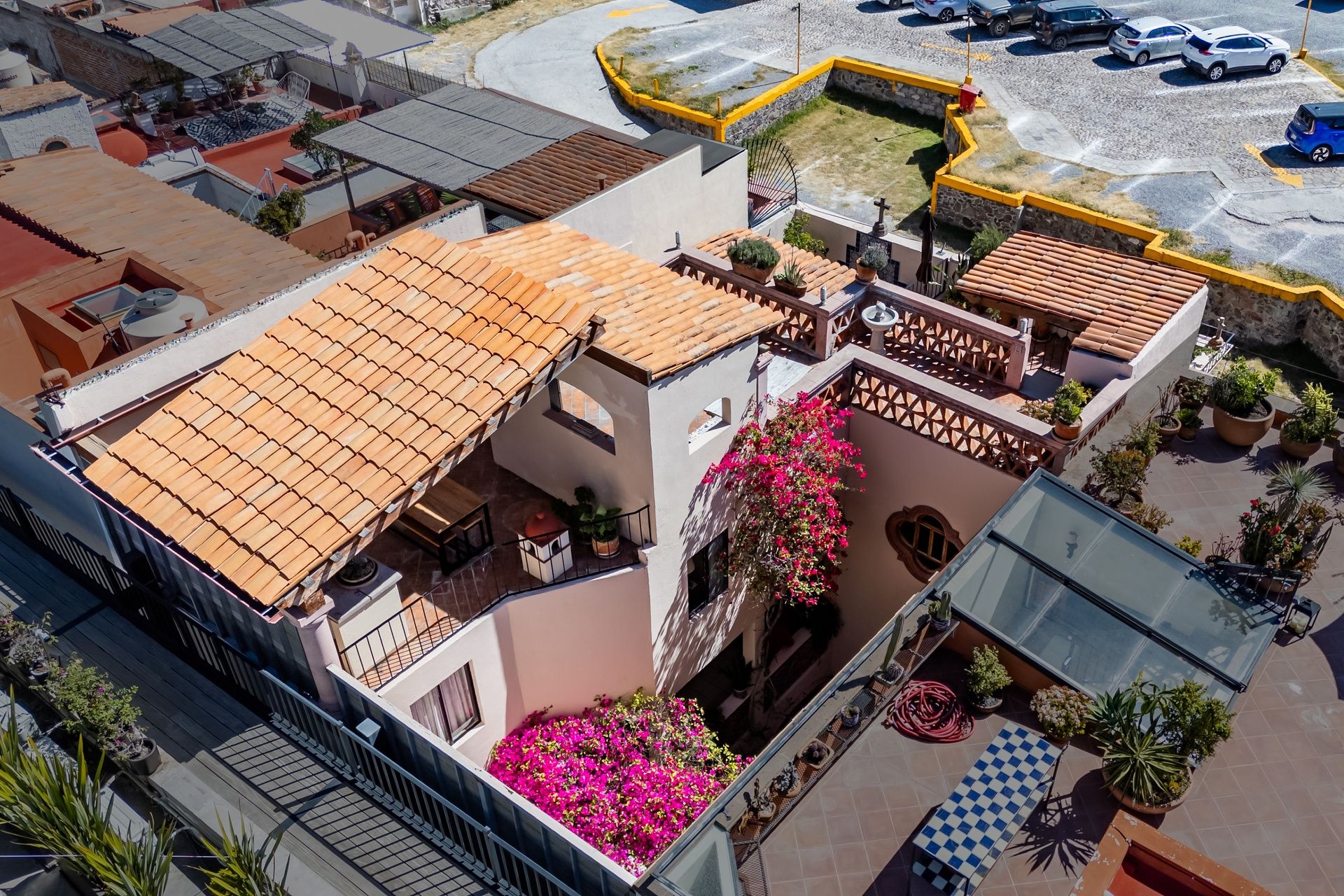 The kitchen is the heart of this narrative, glowing with classic cream-and-blue tile that speaks to San Miguel’s heritage. Its charm is enhanced by thoughtful modern upgrades in stainless steel, creating a space that feels at once nostalgic and inspiring. And when it’s time to entertain on the rooftop, a discreet “vertical waiter” delivers dishes and drinks with elegant ease. Up above, the outdoor kitchen becomes a stage for unforgettable evenings, with La Parroquia rising in the distance like a living painting.