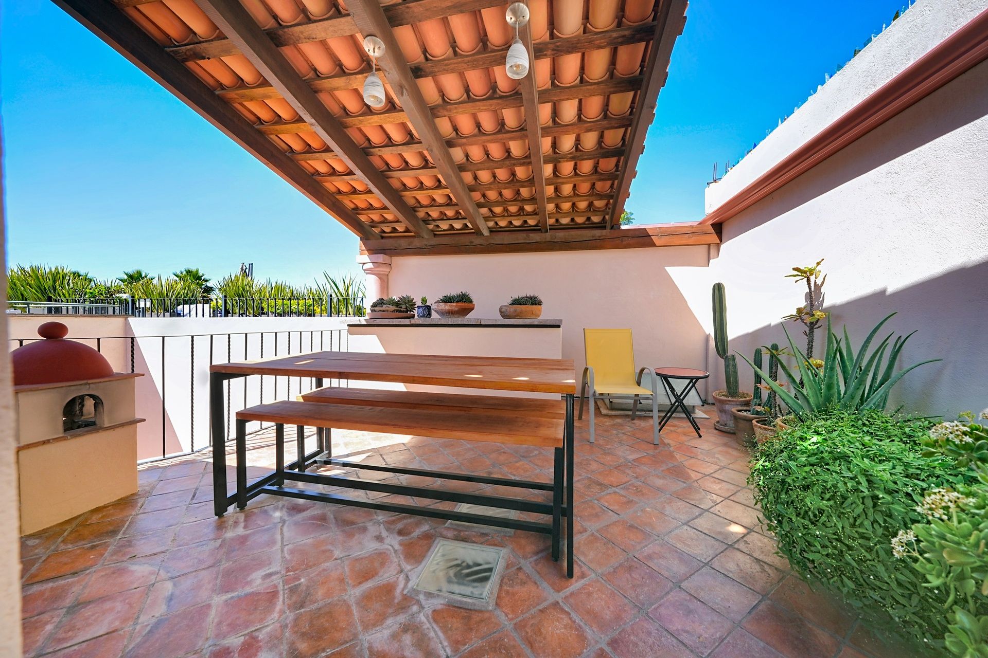 Dining al fresco here is not an occasional treat—it’s a lifestyle, elevated on all four sides of the home. On the ground level, mature greenery wraps the courtyard in privacy. On the second level, a vine-draped trellis frames an intimate table for six outside the Plata Bedroom’s French doors. On the third floor, the Lavender Bedroom opens to a private perch where meals are accompanied by sky and silence. And crowning it all, the shaded rooftop dining room—finished in traditional red clay tile—offers a generous table for gathering friends as the evening sky glows with the Rosewood fireworks.