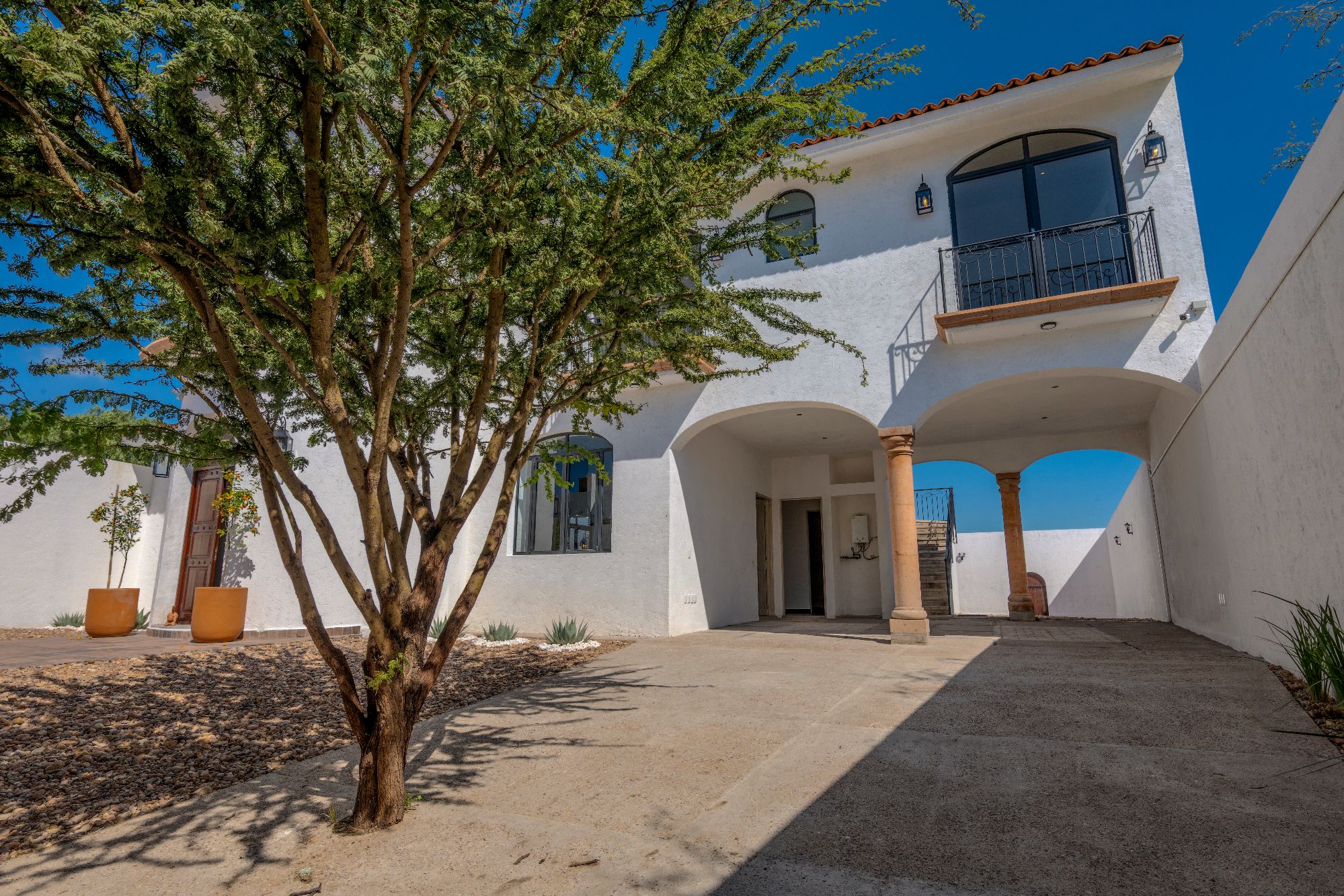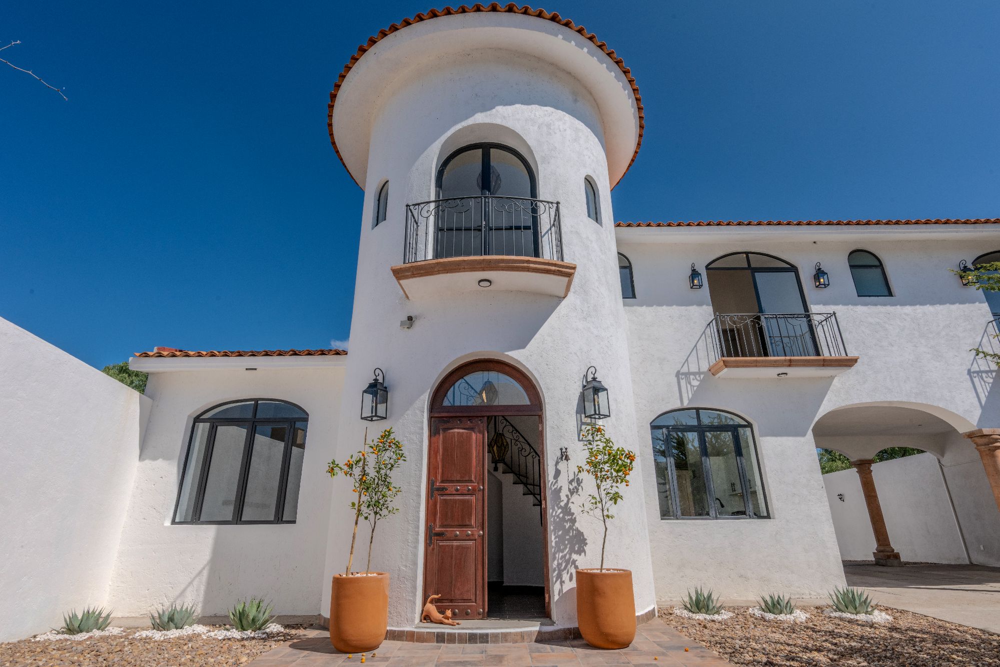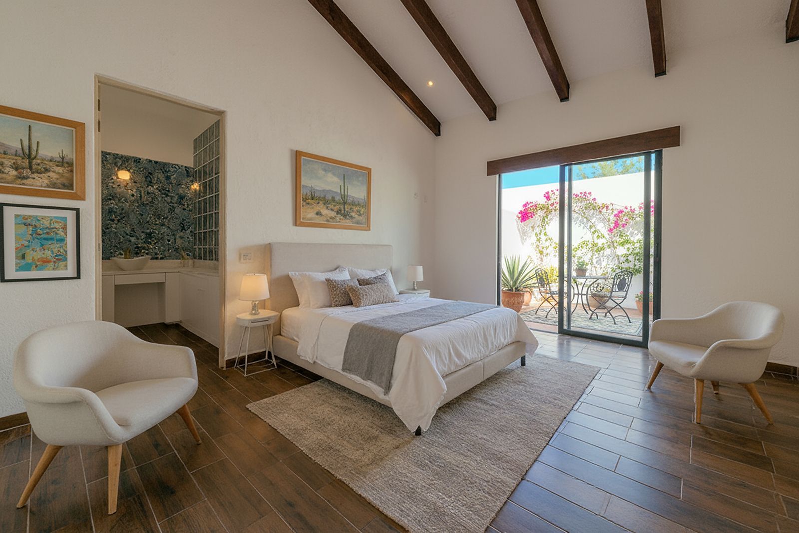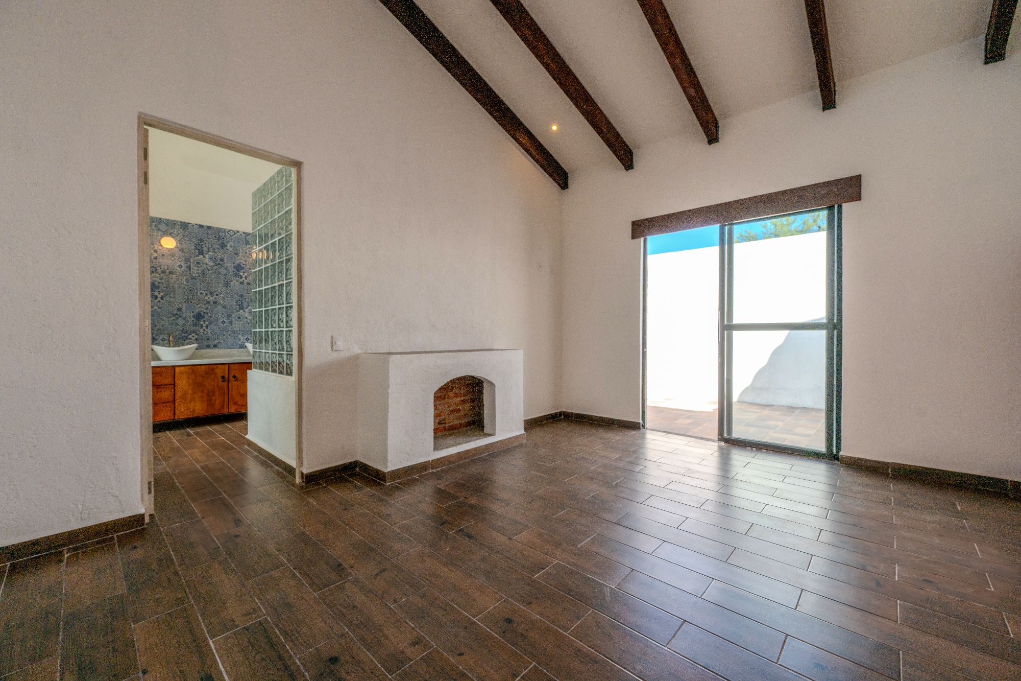 The main house is thoughtfully designed on one level and features two bedrooms and two and a half bathrooms. The master suite includes a fireplace, a spacious walk-in closet, and an ensuite bathroom with both shower and tub. Large glass doors open to a private outdoor area as well as an interior patio, creating a seamless connection between indoor and outdoor living. Throughout the home, natural light fills the spaces, highlighting the pitched clay tile roof and creating a warm, inviting ambiance.