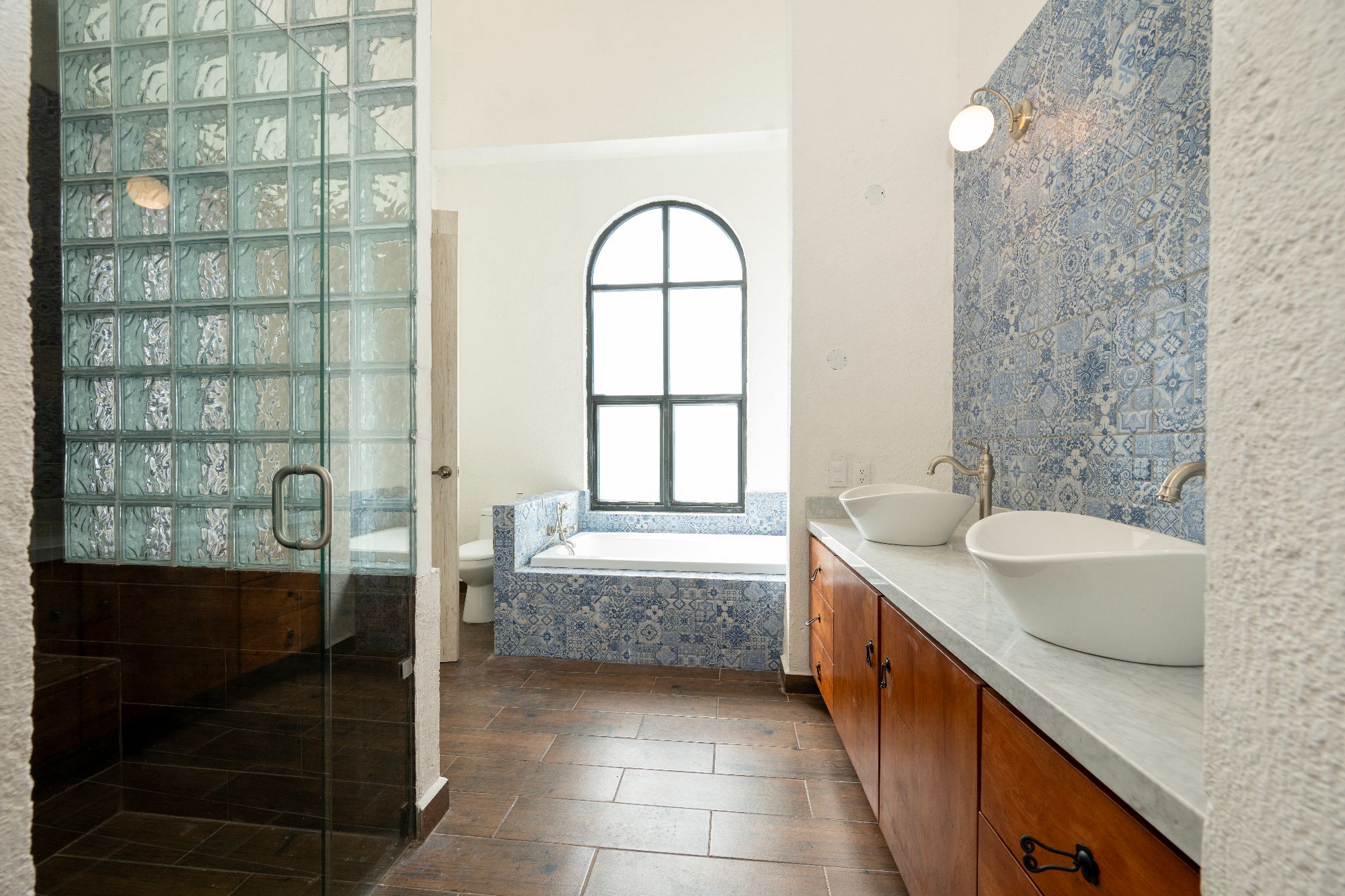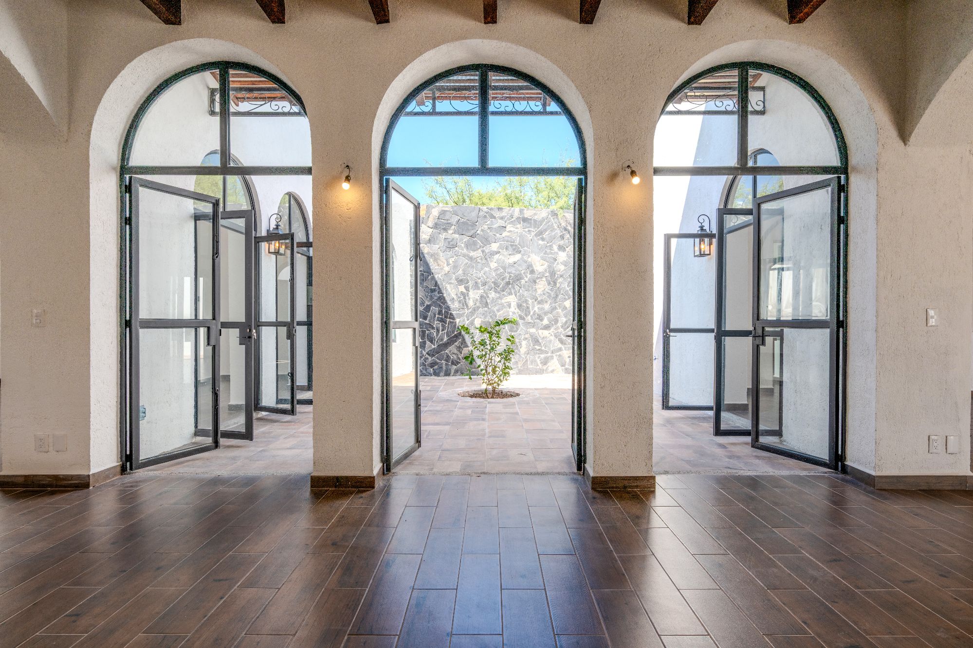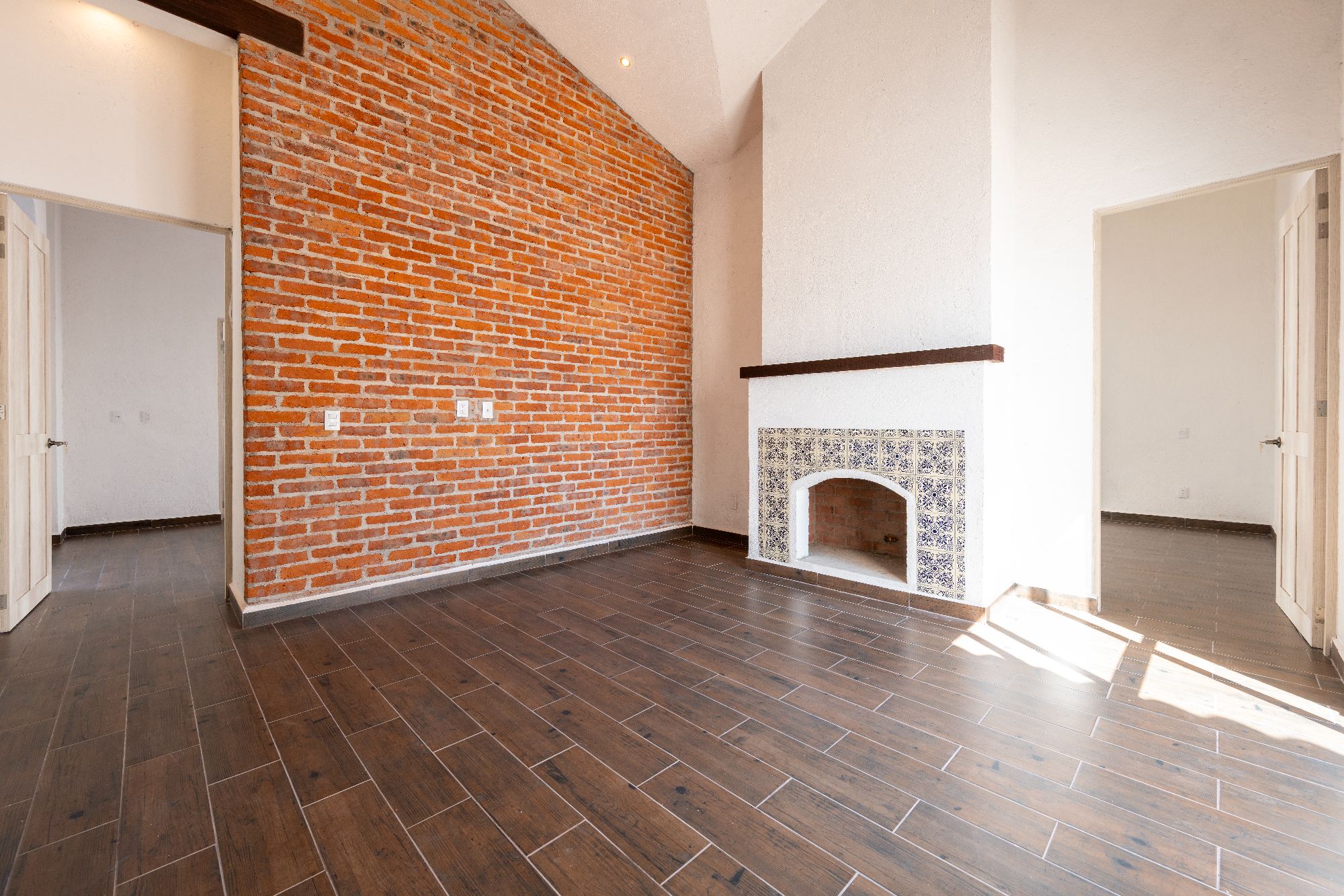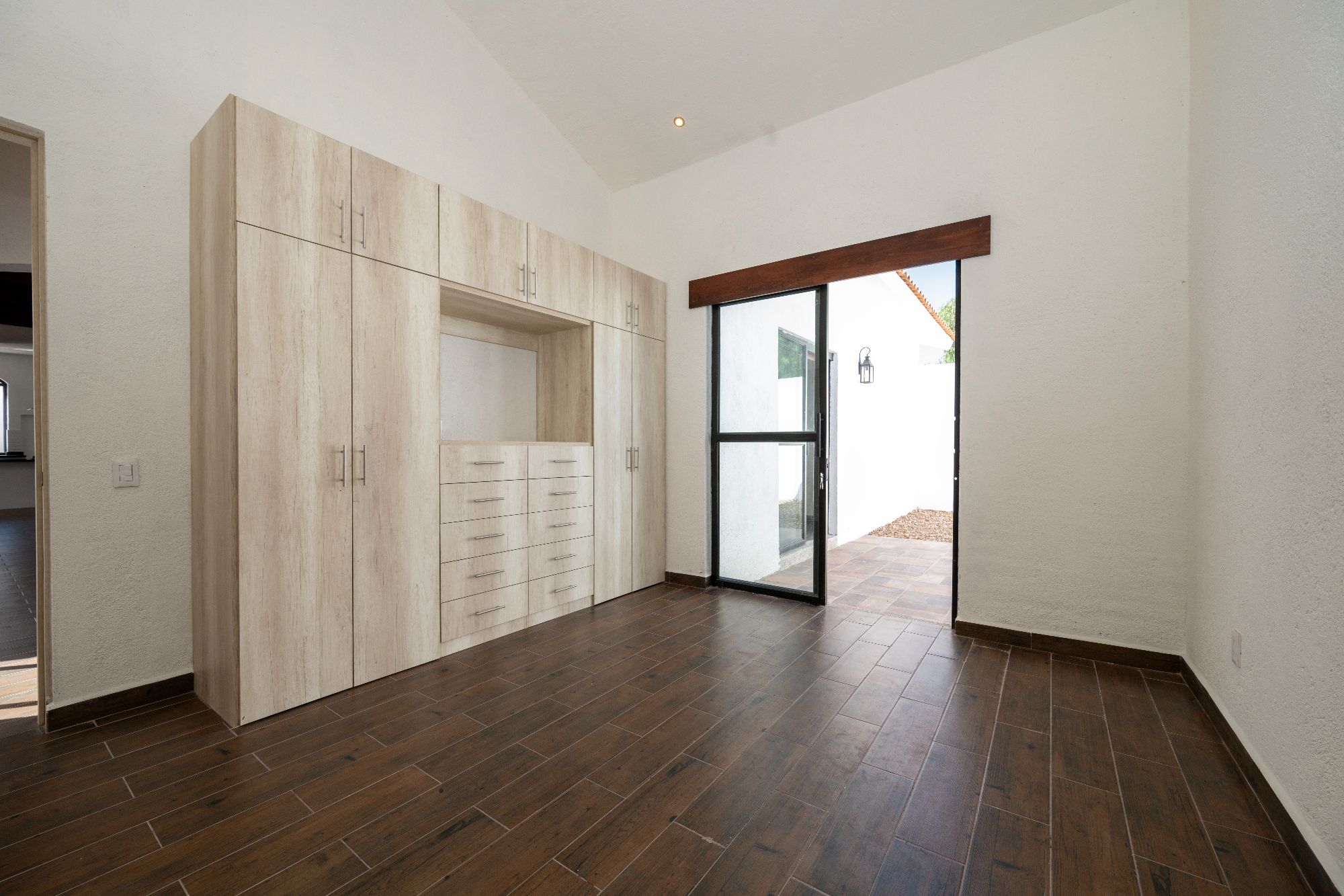 The main house is thoughtfully designed on one level and features two bedrooms and two and a half bathrooms. The master suite includes a fireplace, a spacious walk-in closet, and an ensuite bathroom with both shower and tub. Large glass doors open to a private outdoor area as well as an interior patio, creating a seamless connection between indoor and outdoor living. Throughout the home, natural light fills the spaces, highlighting the pitched clay tile roof and creating a warm, inviting ambiance.