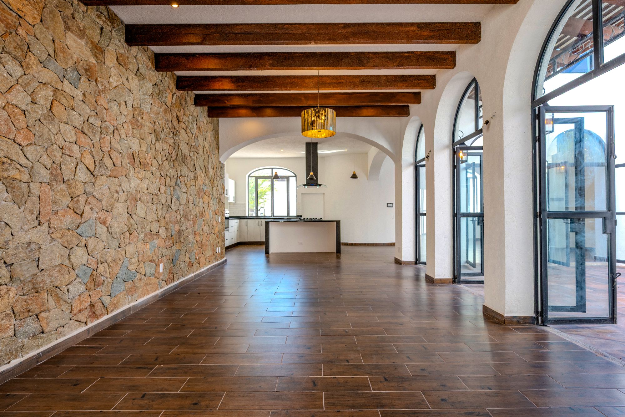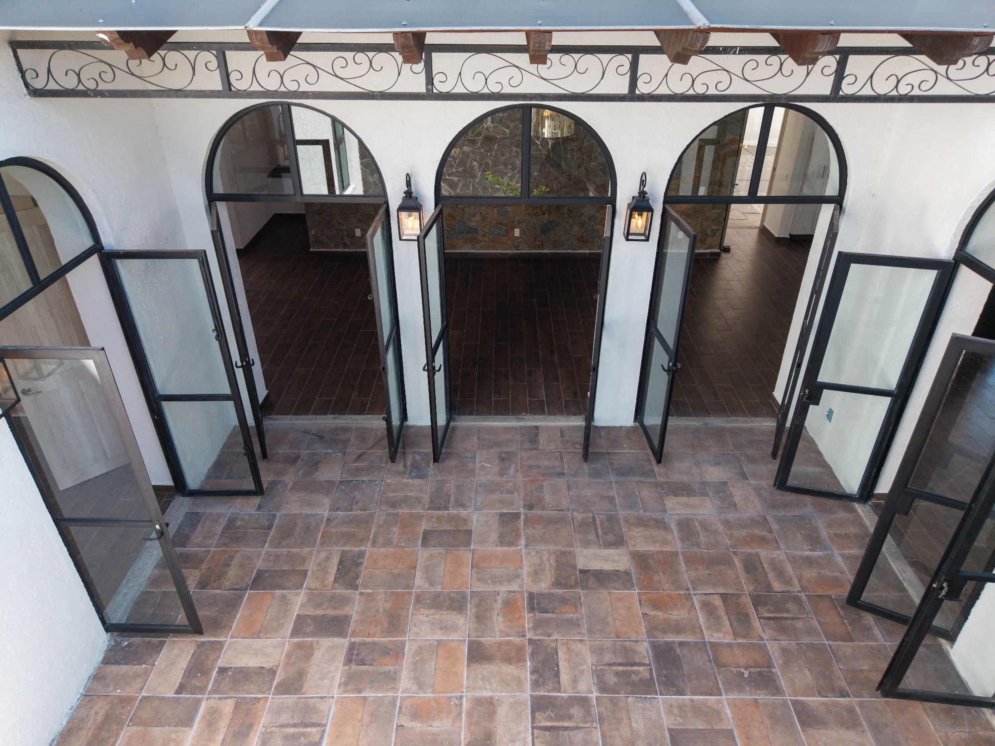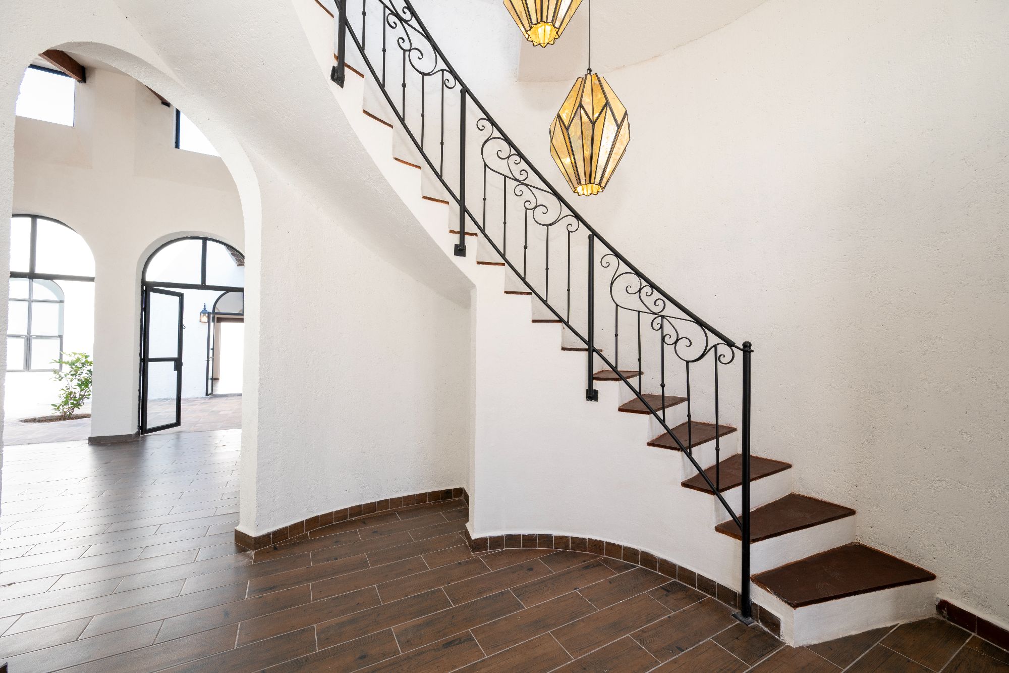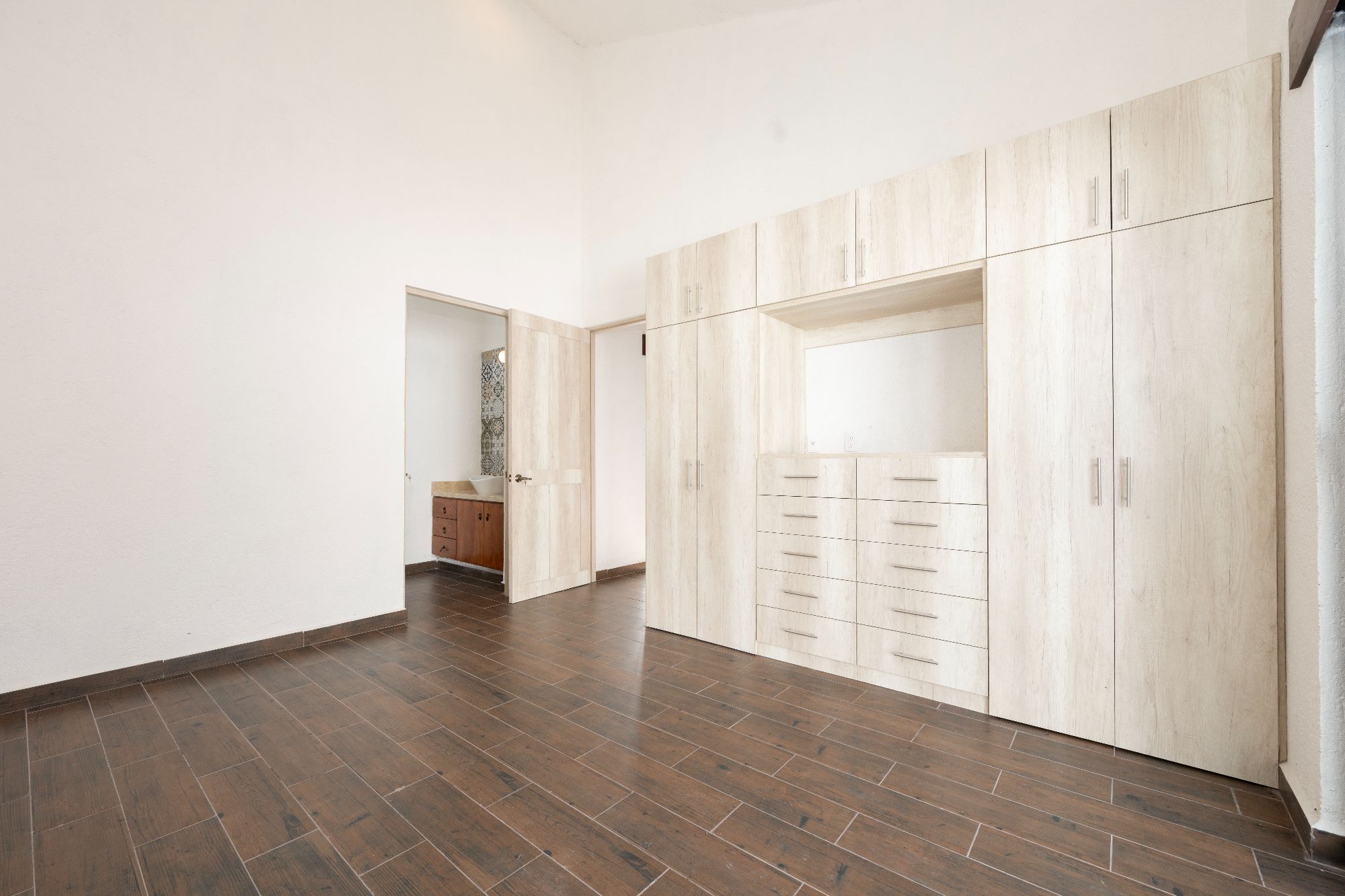 The main house is thoughtfully designed on one level and features two bedrooms and two and a half bathrooms. The master suite includes a fireplace, a spacious walk-in closet, and an ensuite bathroom with both shower and tub. Large glass doors open to a private outdoor area as well as an interior patio, creating a seamless connection between indoor and outdoor living. Throughout the home, natural light fills the spaces, highlighting the pitched clay tile roof and creating a warm, inviting ambiance.