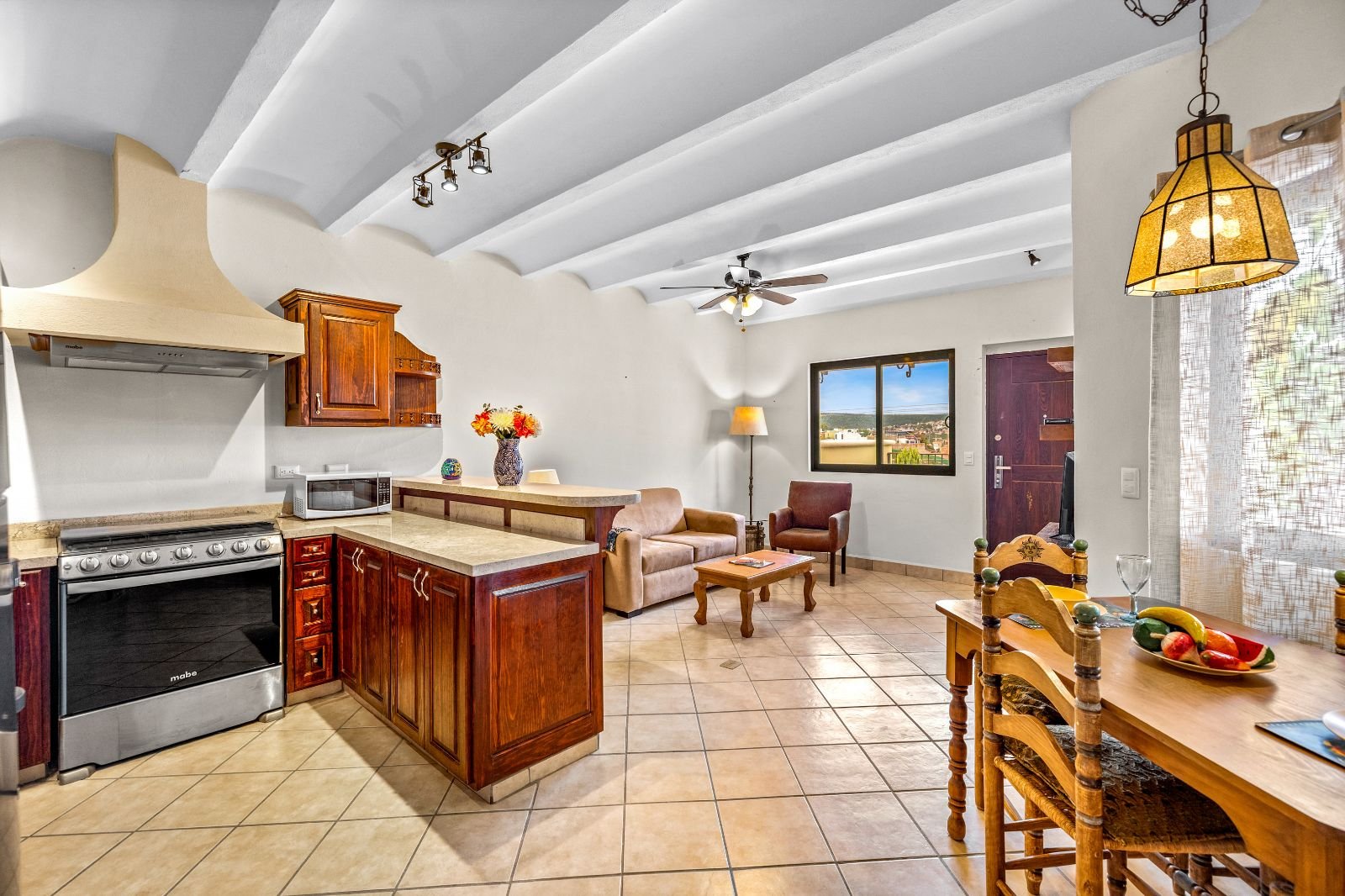 The three individually metered residences blend colonial architecture with modern comfort and convenience. Owner built by Builder/Contractor from the States. The property showcases his hallmark quality construction, thoughtful layout, and refined finishes. Travertine marble and natural wood accentuate the interiors — used in the beams, doors, custom closets, and kitchen cabinetry. Other standout features include trough sinks, pillow bóveda ceilings, clay tile roofing, rustic touches, and sweeping panoramic views of the valley and cityscape.